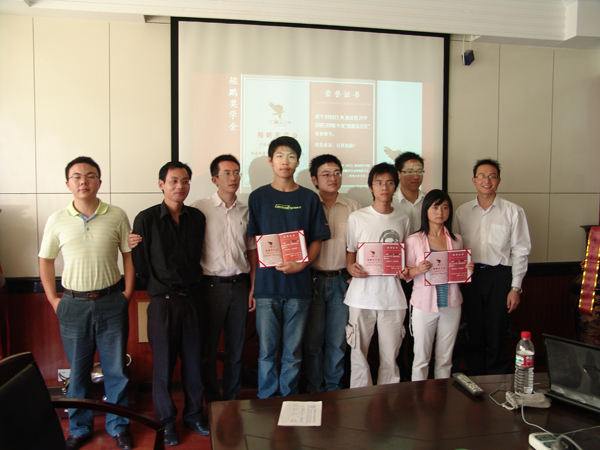 010991班毕业时共22名同学,是一个非常优秀的集体,曾涌现出一名全国优秀三好学生,他们中多名同学本科阶段在《科学通报》、《岩石学报》等高级别刊物上发表过文章,毕业后大多数同学读研。5年过去了,他们中有的已在国际国内知名企业担任重要职位,有的还在继续攻读博士或进博士后流动站深造,有的正在国外学习交流,有3名已留校任教。“鲲鹏奖学金”以99级基地班校友为主,地质班校友参与发起,全部由个人捐资,委托院学工组选拔考核获奖人员。这次他们中的6位校友为获得首届“鲲鹏奖学金”的同学颁奖。