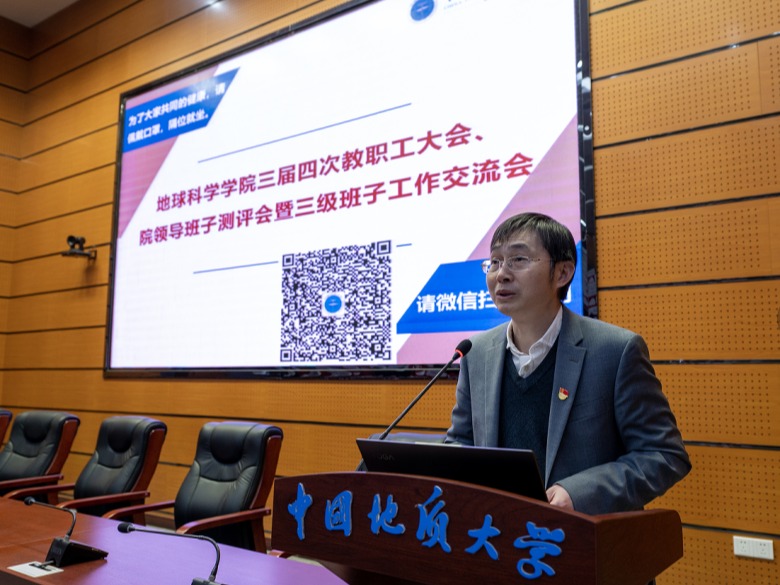 地学院党委书记周刚主持教职工大会、领导班子测评会