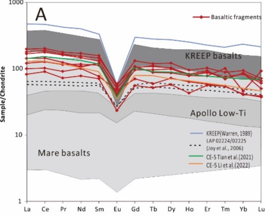 对无斑细粒玄武岩碎屑中微量元素的原位LA-ICP-MS测试发现它们具有较高的稀土元素含量(图3)。这种相对高的稀土含量和配分模式,与部分年轻的月球陨石Northwest Africa (NWA) 032, NWA 4734, LaPaz Icefield (LAP) 02205相似,反映了这些玄武岩可能是月幔经历了低部分熔融程度的产物。此外,在月壤中还发现了玄武质撞击玻璃,其微量元素成分与玄武岩岩屑一致,暗示其可能是原地的玄武岩碎屑撞击熔融的产物。