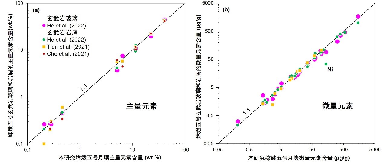 嫦娥五号月壤的主量元素和微量元素含量与其中玄武岩玻璃和岩屑化学成分的对比,结果表明嫦娥五号月壤与下伏玄武岩的化学组成很一致(除了Ni)。