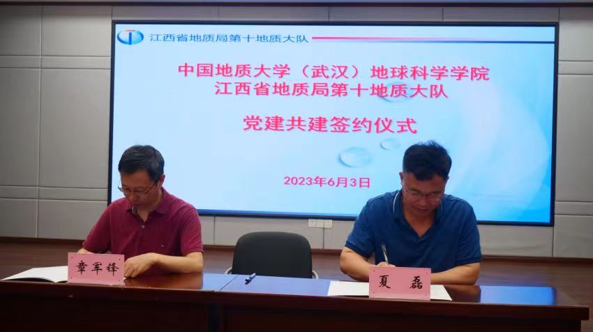 2023年6月3日,av成人电影 院长章军锋、地质调查研究院总工王国灿以及构造地质与地球动力学系一行24人赴江西省地质局第十地质大队开展 “访企拓岗”活动。上午,江西省地质局第十地质大队队长吴美仁、队副总工程师兼自然资源调查院院长欧阳永棚等陪同考察了江西省浮梁县朱溪钨铜矿区。下午,在第十地质大队举行党建和产学研合作签约仪式。第十地质大队队长吴美仁、党委书记夏磊和副总工程师兼自然资源调查院院长欧阳永棚等出席了合作座谈会和签约仪式。