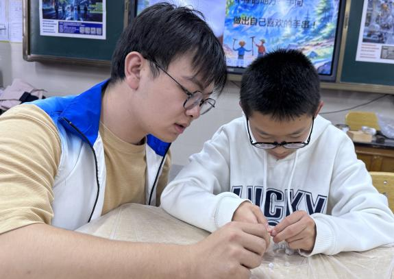本班科普课堂后是DIY串珠手链体验活动,李槟馨在讲台上演示,罗明辉和支教团赵安然老师辅助在各个小组间逐一指导,学生们挑选了喜欢的颜色及矿物珠子原料,按照各自的手腕粗细,完成了自己独一无二的珠宝手链,在学思践悟中感悟珠宝矿物的魅力。