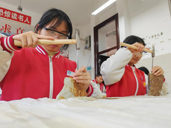 在科普讲座后的化石修复环节,同学们全副武装,佩戴好护目镜、戴好手套,自己动手,让千万年前的化石终得以再见天日,看着自己从岩石里“敲”出来的鱼化石都非常欣喜。在探索过程中,孩子们亲手体验观察、清灰、开凿等一系列化石发掘的流程,化身小小“考古家”,在实践中与数亿年前的生命对话,感悟生命演变的秘密。