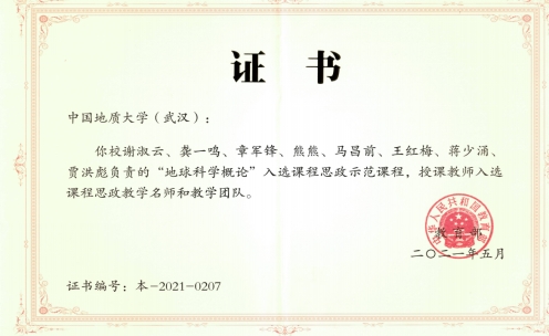 以全校通识教育课程《地球科学概论》为试点,她将课程思政元素融于现代地球科学知识体系中,开启地球科学课程思政教育新模式,主讲完成的《地球科学概论》MOOC于2020年正式上线,入选教育部本科思政示范课程和国家一流本科课程。她本人及团队在第二届湖北省高校教师教学创新大赛中荣获正高组二等奖,展现了现代地球科学教学创新与课程思政的突出成绩。