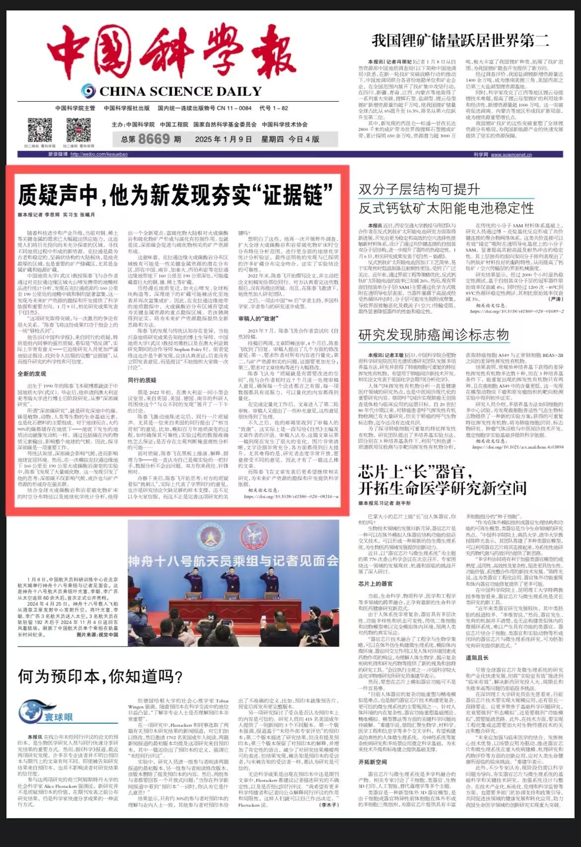 1月9日,av成人电影 陈春飞教授与长江大学刘勇胜教授、澳大利亚Stephen Foley教授等科学家合作在国际顶级期刊《自然》上发表了题为《克拉通边缘碳酸盐熔体迁移形成富硫化物大陆根:Sulfide-rich continental roots at cratonic margins formed by carbonated melts》的研究论文。《中国科学报》头版报道了这一成果,以下为报道全文。
