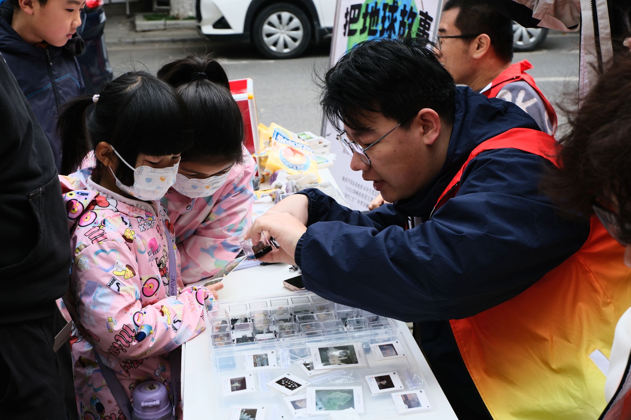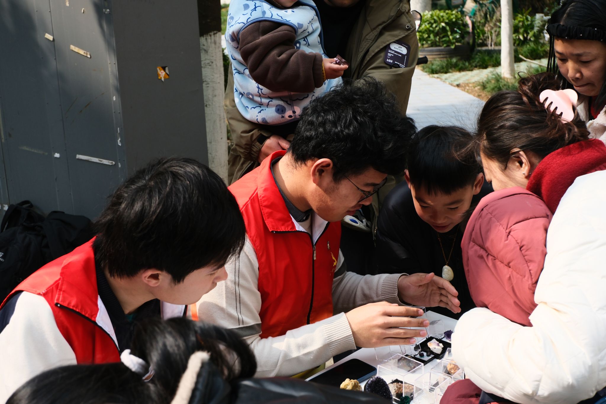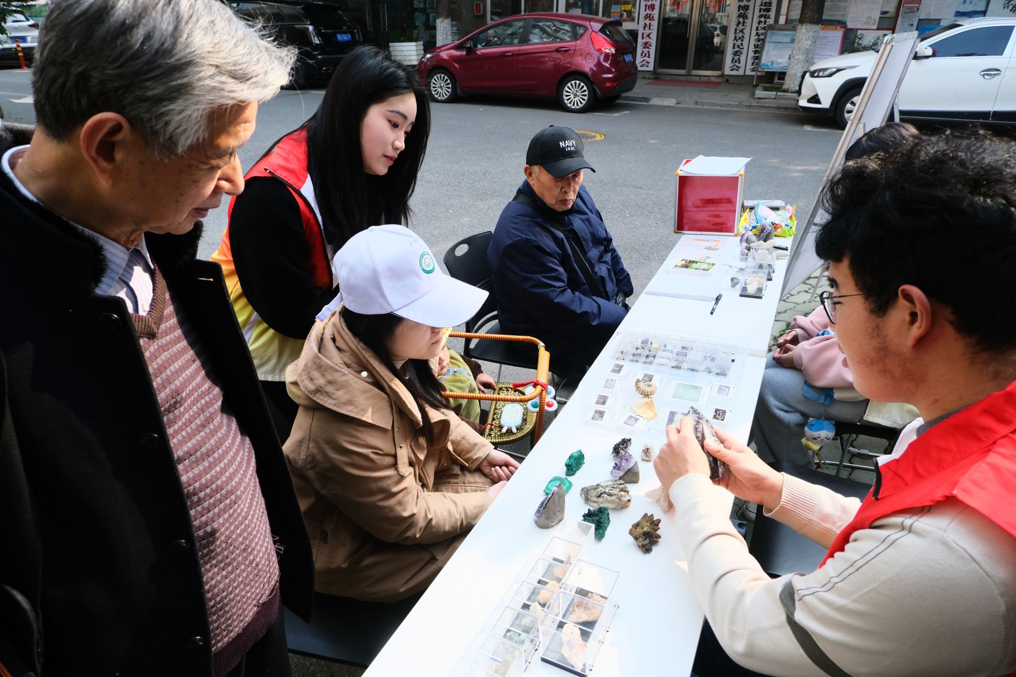 不止小朋友们,许多社区内的老人们也被这生动的讲解深深吸引,他们围在一旁,听得津津有味,仿佛也随着志愿者的描述,穿越回那遥远的时代。一位白发苍苍的老人,眯着眼睛,仔细端详着一块化石,嘴里喃喃自语:“真是神奇啊,没想到这些看似普通的石头,竟然藏着这么多的秘密。”另一位曾在地大教过课的老先生也对志愿者们的行为赞不绝口:“这样的活动非常有意义,不仅让孩子们增长了知识,也让我们这些老人重温了地质学的魅力。看到你们如此热衷于科学普及,我感到非常欣慰。”老先生的话语中饱含着对青年学生的鼓励和期待,也极大地鼓舞了志愿者们投身志愿服务的信心和信念。