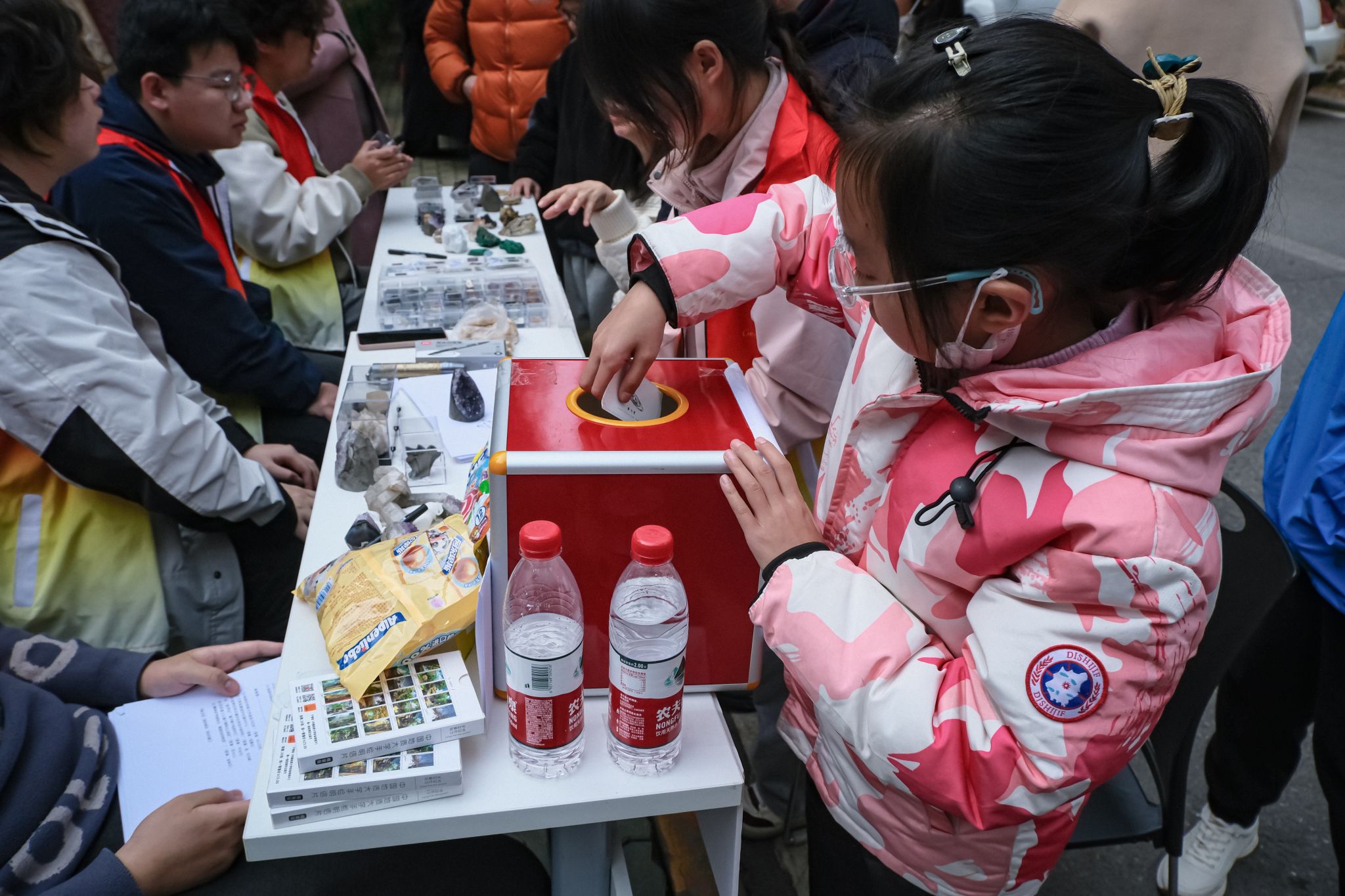 “每一块矿石都是凝固的星系密码,每枚化石都在砂岩中封存着远古的时钟”,当志愿者们把精美的矿物标本和化石标本展出的那一刻,社区内众多的小朋友都被这些来自地球深处的宝藏深深吸引。他们好奇地围在展台前,瞪大眼睛,仔细观察着这些历经千万年变迁的自然奇迹。